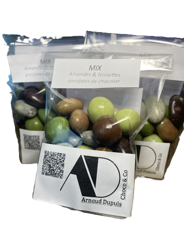 Retrouvez un savoureux mélange de confiseries : des amandes de France enrobées de chocolat noir et chocolat blanc, des amandes de France enrobées d'un délicieux chocolat au café pur arabica, de belles noisettes du sud de la France enrobées de chocolat au lait ou de chocolat blanc, des amandes de France enveloppées de nougatine puis d'une couche de chocolat noir.